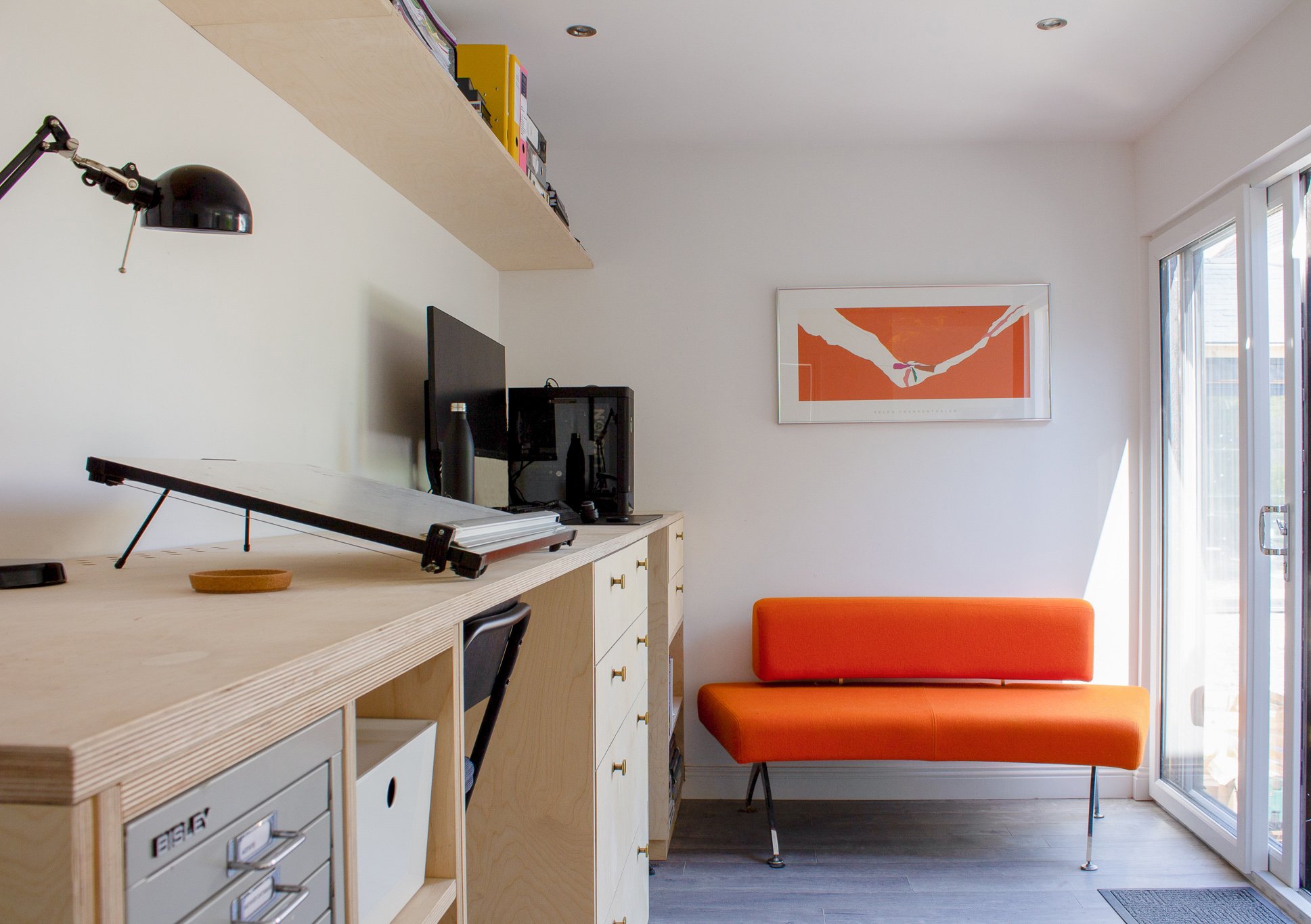 Working from the outset of design and installation of a garden office pod, AODH Design designed, built and installed a it’s interior for an architectural studio. Our challenge was ensuring there would be the required storage for architectural equipment and documents, while also keeping the small space uncluttered with sufficient work spaces, both sitting and standing.